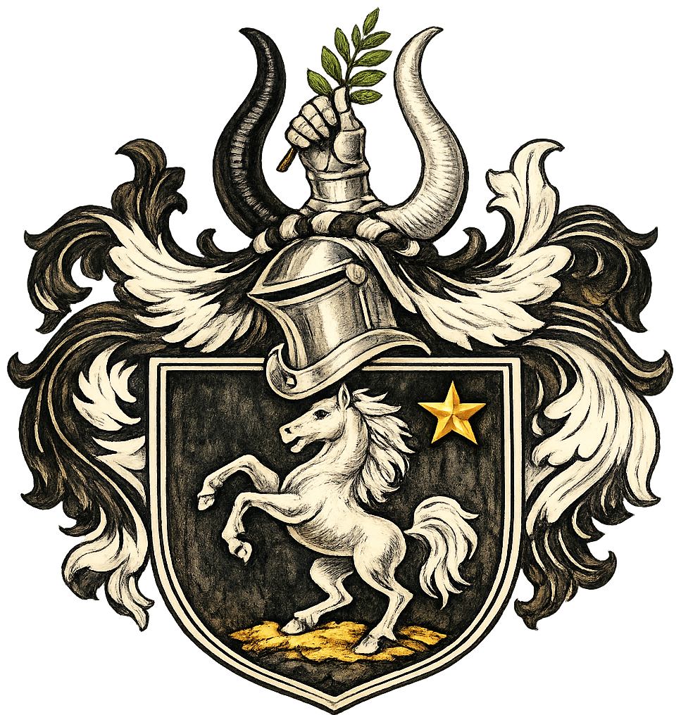 In plain terms: a silver horse on black proclaims the Swedish noble house Rappe (ennobled 17 May 1675; introduced 1697, no. 1284), on the armiger's maternal grandfather's side; the gold star at the upper left honours house Sparre Över Stjärna (ancient Swedish nobility), on the maternal grandfather's side; and the gold embattled bar along the base recalls forebears' estates and fortified houses in the Nordic countries and in the British Isles. The crest fuses strands from Vachell (Anglo-Norman gentry family), on the maternal grandfather's side, Rosengren (ennobled 1534), on the paternal grandfather's side, and Ehrenlund (ennobled 1719; introduced 1720, no. 1599), on the maternal grandfather's side, pointing to service recognised with honour.