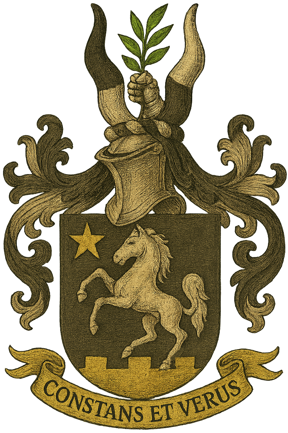 Blazon: Arms—Sable, a horse salient Argent; in dexter chief a mullet Or; in base a fess embattled Or. Crest—Between two buffalo horns per fess Sable and Argent, a gauntlet erect Argent holding a laurel sprig Vert. Mantling—Sable doubled Argent. Motto—CONSTANS ET VERUS.