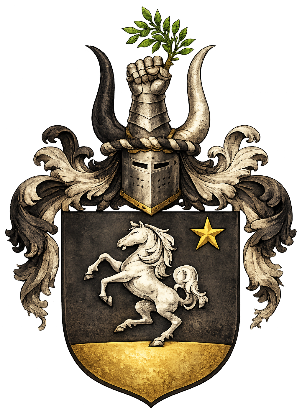 In plain terms: a silver horse on black proclaims the Swedish noble house Rappe (ennobled 17 May 1675; introduced 1697, no. 1284), on the armiger's maternal grandfather's side; the gold star at the upper left honours the Bure kin (ancient nobility; later a branch ennobled 1621/1624 and introduced 1627 as no. 126), on the paternal grandfather's side; and the gold embattled bar along the base recalls forebears' estates and fortified houses in the Nordic countries and in the British Isles. The crest fuses strands from Gagge (Danish–Scanian ancient nobility), on the maternal grandmother's side, Stålhandske (ennobled 1574/1578; introduced 1625, no. 98), on the paternal grandfather's side, and Ehrenlund (ennobled 1719; introduced 1720, no. 1599), on the maternal grandfather's side, pointing to service recognised with honour.